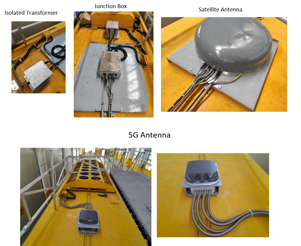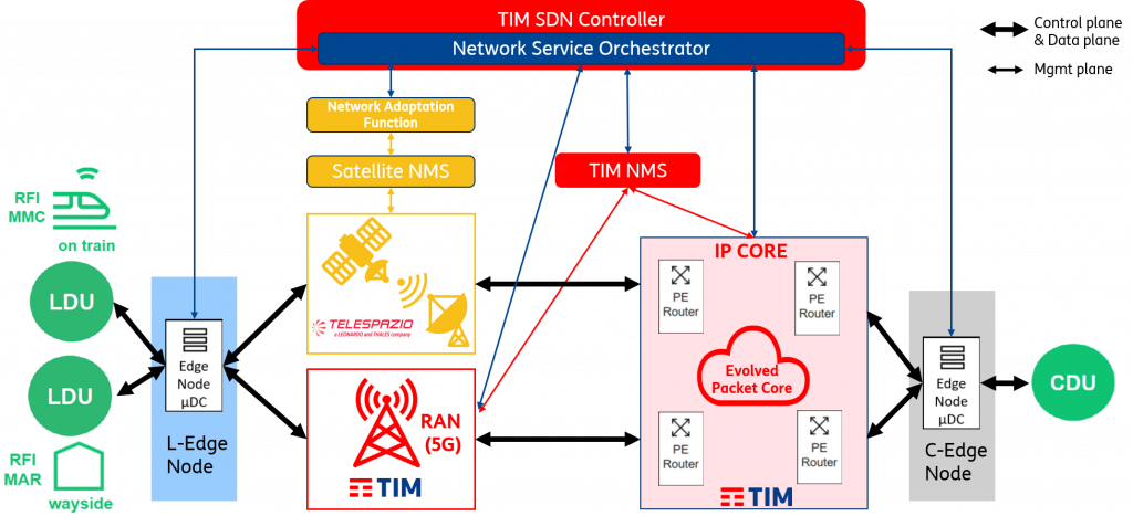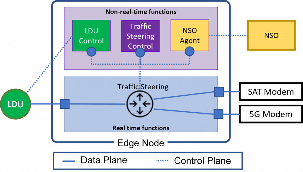 Integrated communication is provided by an ad hoc EdgeNode attached to each LDU. The main feature of DINoS5G EdgeNode consists in smartly steering railway diagnostic traffic through the RAN access that best suits transfer requirements, taking into account 5G network or SAT network conditions (performance indicators) measurable at a given point in time and space.